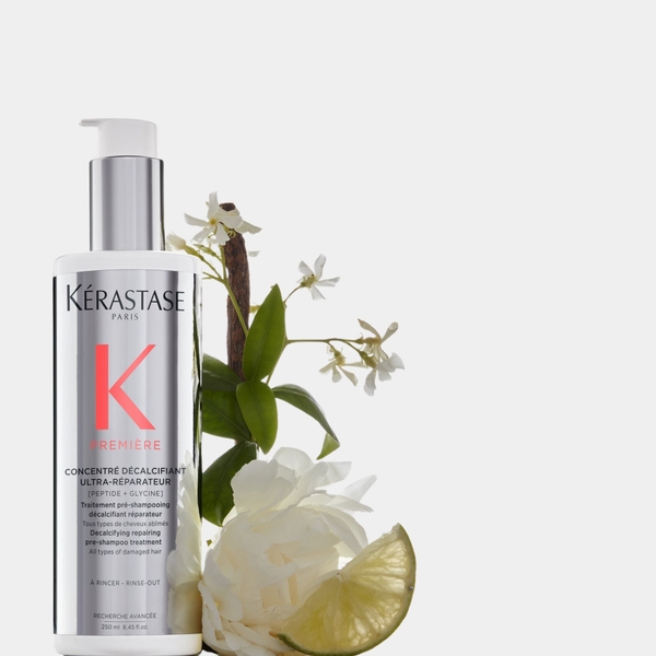 Kérastase Première Concentré Décalcifiant Ultra-Réparateur được pha chế với nồng độ 8% Axit Citric nguyên chất và Glycine, giúp dưỡng tóc trước khi gội đầu, tác động lên cả lớp tóc bên trong và bên ngoài để trung hòa độ xỉn màu và cứng đờ. Công thức này tái tạo các liên kết keratin bị đứt gãy để giảm gãy rụng.