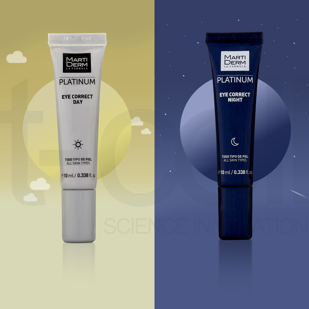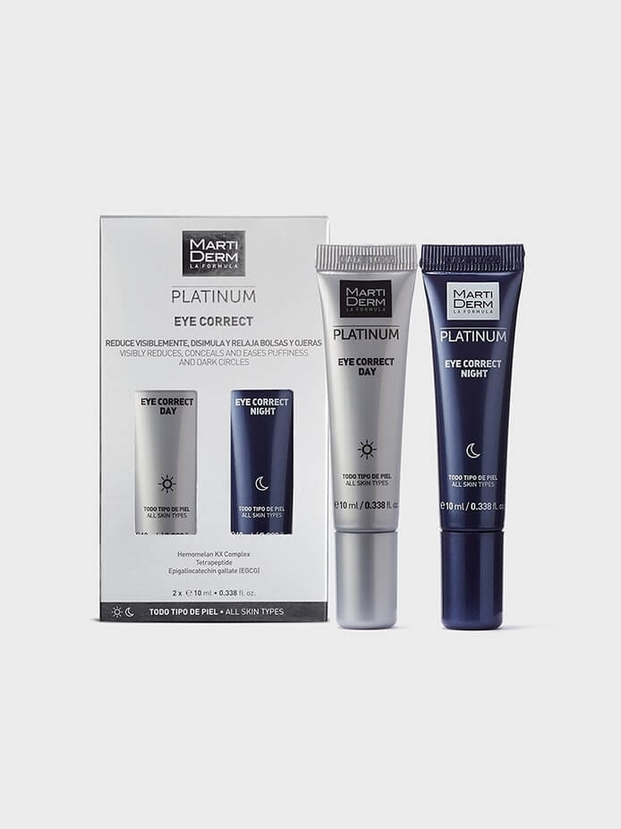 MartiDerm Platinum Eye Correct là bộ kem dưỡng da vùng mắt gồm 2 tuýp riêng biệt, dùng vào buổi sáng và buổi tối, phù hợp để sử dụng hằng ngày cho da mắt đang gặp các vấn đề về quầng thâm và bọng mỡ dưới mắt. Công thức chứa phức hợp độc quyền Hemomelan KX (Vitamin K oxit và Tranexanic Acid) và EGCG (Epigallocatechin Gallate), đi kèm một số thành phần khác nhau ở mỗi sản phẩm. Kết cấu dịu nhẹ cho vùng da nhạy cảm và cực kì mỏng manh dưới mắt. Sản phẩm giúp vừa chăm sóc vừa giúp che khuyết điểm mà không cần phải sử dụng đến các loại kem trang điểm dày bí khó chịu.