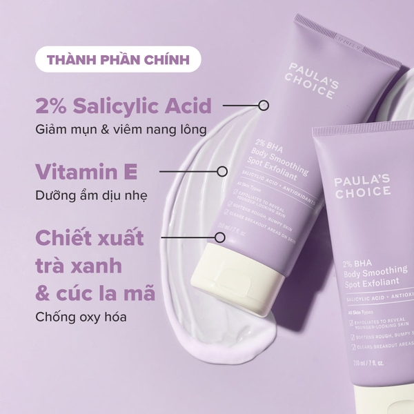 Paula's Choice 2% BHA Body Smoothing Spot Exfoliant là phiên bản đặc biệt dành cho thị trường Việt Nam. Sản phẩm dưỡng thể dạng chấm điểm, với khả năng chăm sóc và cải thiện các vấn đề như mụn cơ thể, dày sừng nang lông hay viêm nang lông tại cánh tay, chân, lưng và ngực, trả lại làn da láng mịn và tràn đầy sức sống