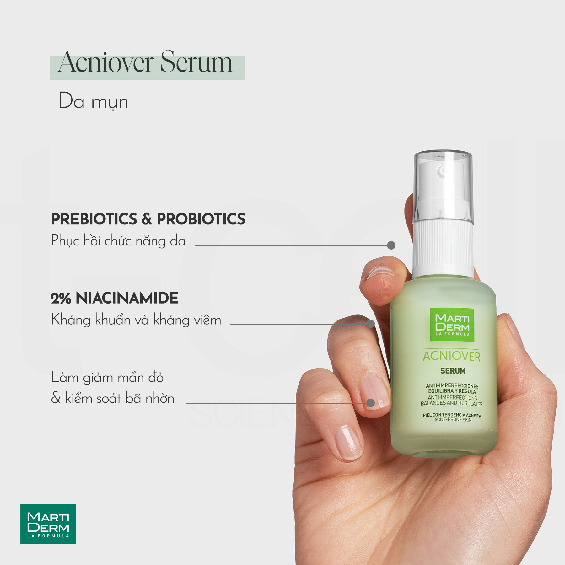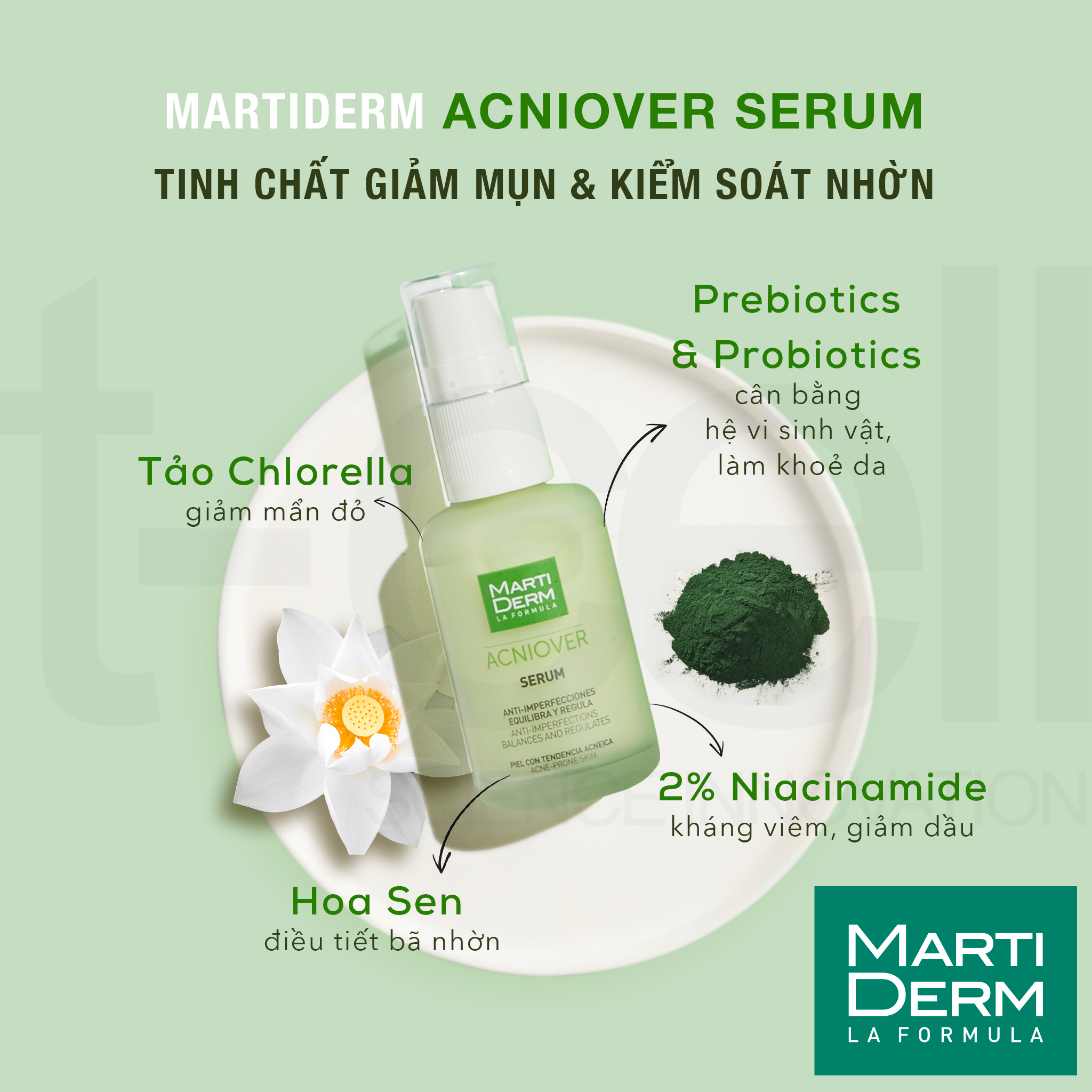 MartiDerm Acniover Serum là một trong ba bước quan trọng chăm sóc da mụn của Martiderm, giúp ngăn ngừa và làm mụn hiệu quả thông qua cơ chế kiểm soát bã nhờn, cân bằng hệ vi sinh vật trên da và tăng cường hàng rào bảo vệ da khoẻ mạnh.