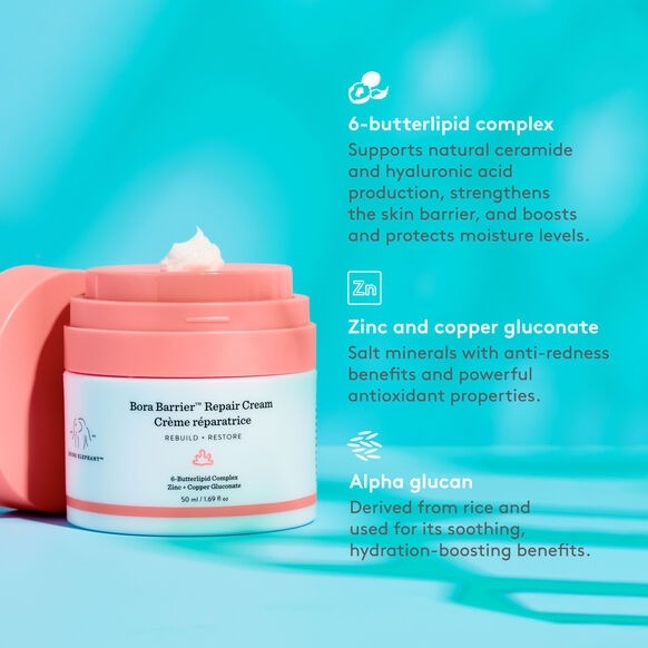 Drunk Elephant Bora Barrier Repair Cream được bổ sung glucosyl ceramides, giúp phục hồi hàng rào bảo vệ da, đồng thời tăng cường và bảo vệ độ ẩm- glycosphingolipids giúp cải thiện độ đàn hồi và sức mạnh hàng rào bảo vệ da, trong khi beta-sitosterol thúc đẩy sản xuất axit hyaluronic. Kẽm gluconate giúp giảm mẩn đỏ và cung cấp khả năng chống oxy hóa.