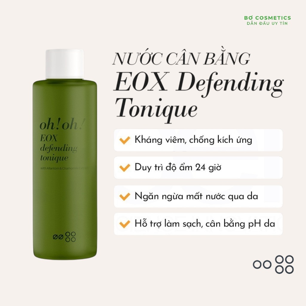 Nước Cân Bằng, Làm Sạch Và Chống Oxy Hóa oh!oh! EOX Defending Tonique là nước cân bằng đa năng giúp làm sạch, dưỡng ẩm và duy trì độ pH lý tưởng cho mọi loại da. Công thức kết hợp bộ ba đường tự nhiên Xylitol, Anhydroxylitol, Xylitylglucoside cùng chiết xuất hoa cúc Đức giúp kháng viêm, bảo vệ da khỏi các tác nhân gây hại và ngăn ngừa mất nước hiệu quả.