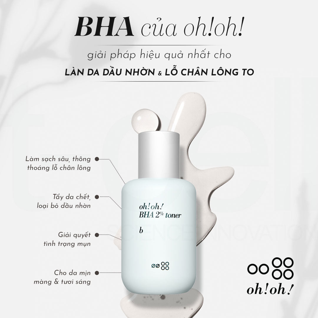 Oh!Oh! BHA 2% Toner với thành phần nổi bật là nồng độ 2% BHA (Salicylic Acid), lý tưởng cho làn da dầu mụn. Với công nghệ tiên tiến, oh!oh! đã thành công khi kết hợp BHA cùng với các hoạt chất hiệu quả khác giúp mang lại hiệu quả tối ưu trên bề mặt da sau khi sử dụng. Với dòng sản phẩm này, làn da của bạn sẽ được làm sạch chuyên sâu, cân bằng độ pH, mang đến sự mềm mịn và trắng sáng cho da mà không gây khô căng hay kích ứng.