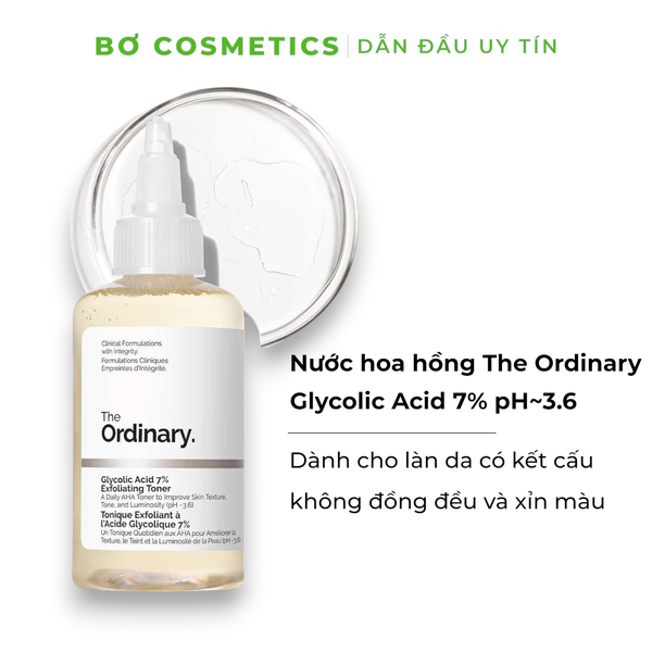 Dùng nước hoa hồng The Ordinary Glycolic Acid 7% Toning Solution pH~3.6 vào buổi tối.