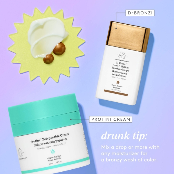 Drunk Elephant D-Bronzi Anti-Pollution Drops với thành phần chronopeptide mô phỏng lợi ích chống oxy hóa của vitamin D giúp làm đẹp da mà không gây hại cho da dưới ánh nắng mặt trời.