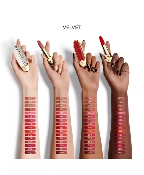 Son Môi Guerlain Rouge G Refill Velvet nhung lì sở hữu bảng màu độc quyền được thiết kế riêng cho mọi phong cách và tông da. Mỗi sắc thái đều được các phòng thí nghiệm của Guerlain tỉ mỉ bào chế với các sắc tố màu mạnh mẽ được kết hợp từng chút một và được tăng cường bởi sức mạnh tăng cường màu sắc của dầu Abyssinian, cho màu sắc rực rỡ, tươi sáng