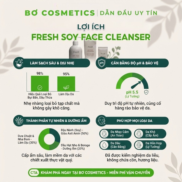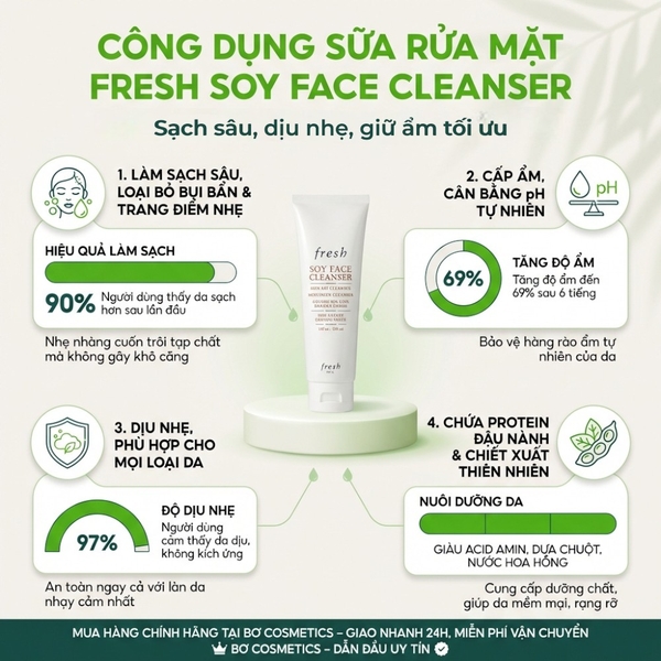 Sữa Rửa Mặt Fresh Soy Face Cleanser: Sữa rửa mặt dịu nhẹ nhưng hiệu quả, có tác dụng làm dịu, dưỡng ẩm và tẩy trang hàng ngày, mang lại vẻ ngoài khỏe mạnh theo thời gian