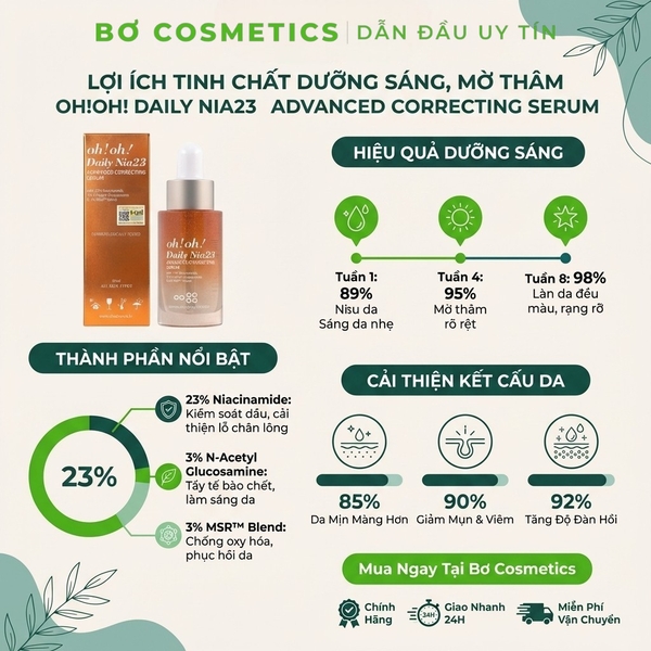 Tinh Chất Dưỡng Sáng, Mờ Thâm Oh!Oh! Daily Nia23 Avanced Correcting Serum là serum dưỡng sáng chuyên sâu với nồng độ 23% Niacinamide. Công thức kết hợp cùng 3% NAG và Peptide độc quyền giúp kiểm soát dầu hiệu quả, thu nhỏ lỗ chân lông và mờ thâm nám vượt trội.