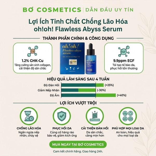 Oh!Oh! Flawless Abyss Serum hỗ trợ tái cấu trúc da, cải thiện độ đàn hồi và duy trì vẻ tươi trẻ cho những làn da cần phục hồi sau điều trị.