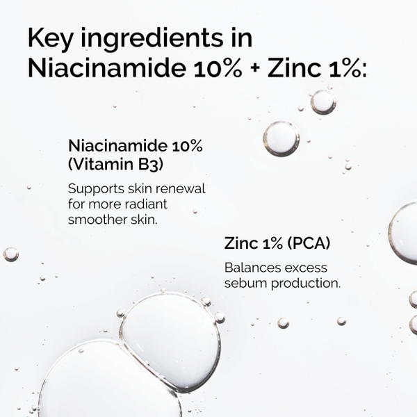 Serum The Ordinary Niacinamide 10% + Zinc 1% chứa niacinamide (vitamin B3) nồng độ cao (10%) cùng với Zinc PCA giúp cải thiện tình trạng da xỉn màu, kết cấu da không đều màu và dầu thừa. Niacinamide 10% + Zinc 1% còn giúp thu nhỏ lỗ chân lông và làm sáng da.