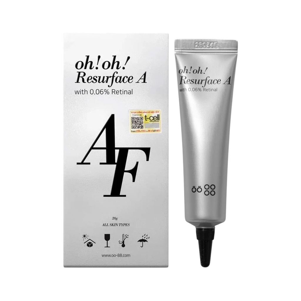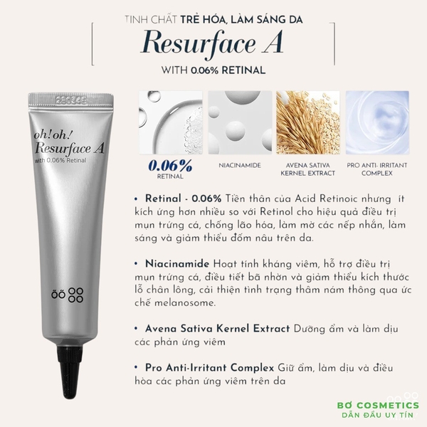Tinh Chất Trẻ Hóa, Làm Sáng Da Oh!Oh! Resurface A là tinh chất giúp tái tạo và phục hồi làn da bị lão hóa mang lại làn da khỏe mạnh và căng mịn. Với sự kết hợp giữa Retinaldehyde và Niacinamide làm mờ nếp nhăn và điều tiết bã nhờn. Công thức bổ sung Chiết xuất Yến mạch (Oat Extract) và Allantoin giúp làm dịu, bảo vệ và thúc đẩy quá trình phục hồi da nhanh chóng.