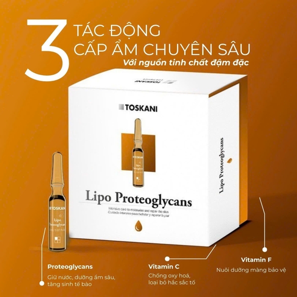 Toskani Lipo Proteoglycans Ampoule – Tinh Chất Trẻ Hóa & Làm Đầy Nếp Nhăn được bào chế với Liposomal Proteoglycans, giúp cấp ẩm sâu cho da, ngăn ngừa mất nước qua da, kích thích sản sinh collagen, tăng độ săn chắc da và ngăn ngừa các dấu hiệu lão hóa da.